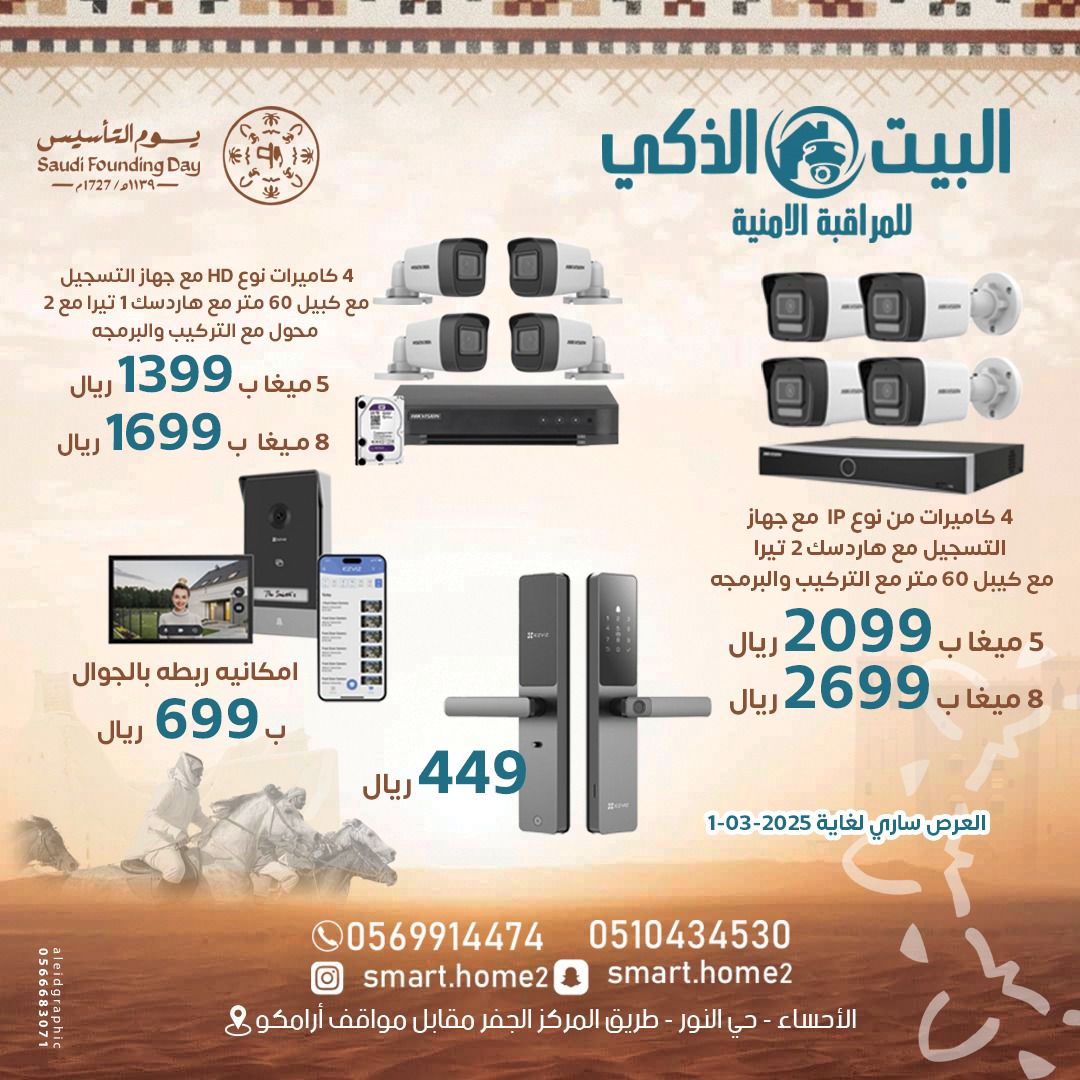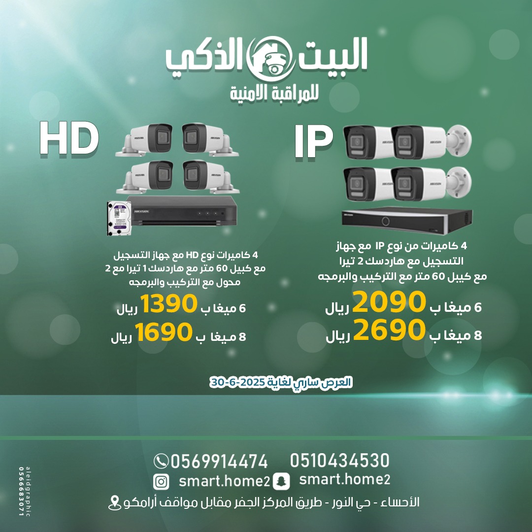 ١- ٤ كاميرات نوع HD مع جهاز التسجيل مع سلك ٦٠ متر مع هاردسك ١ تيرا مع ٢ محول مع التركيب والبرمجه ٦ ميغا ب ١٣٩٠ ريال ٨ ميغا ١٦٩٠ ريال ٢- ٤ كاميرات من نوع IP مع جهاز التسجيل مع هاردسك ٢ تيرا مع سلك ٦٠ متر مع التركيب …